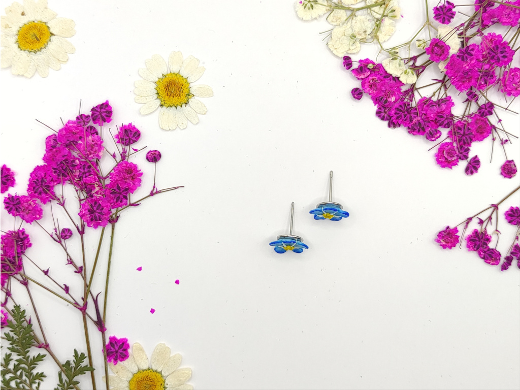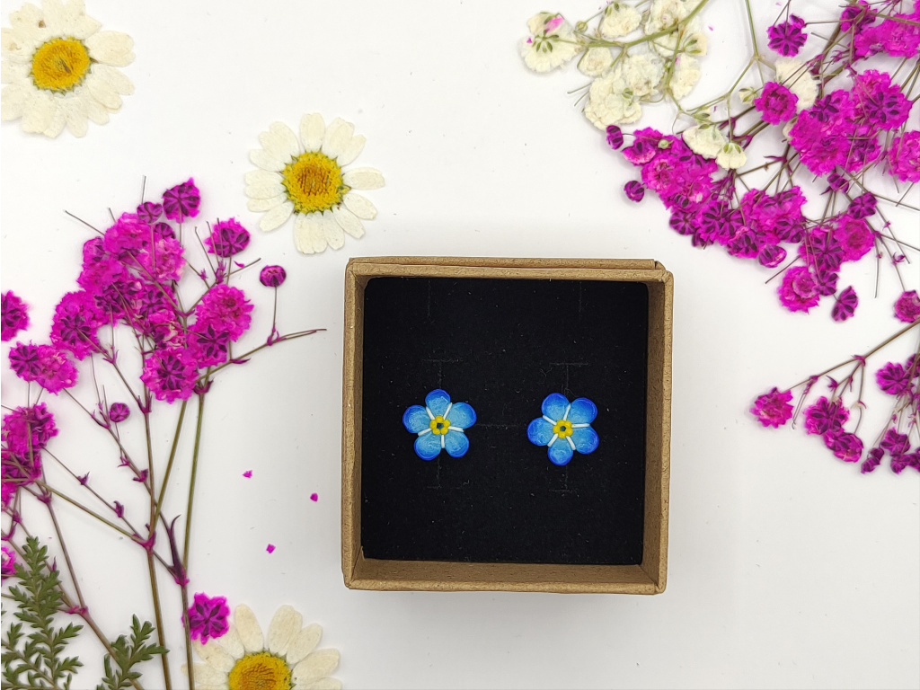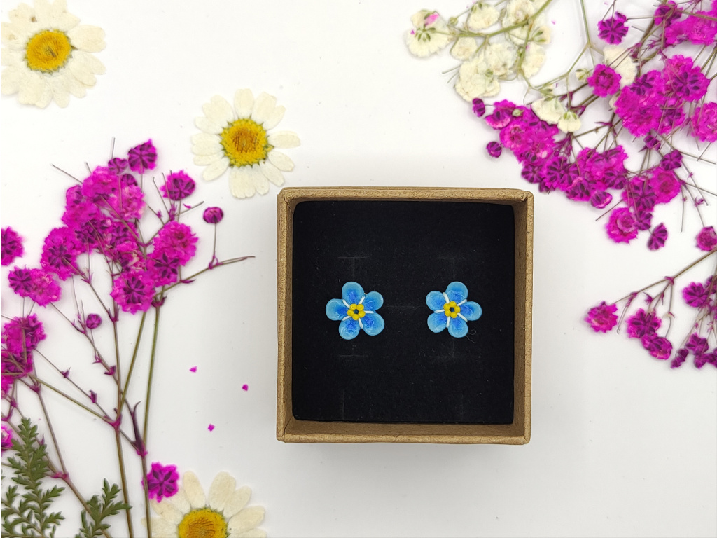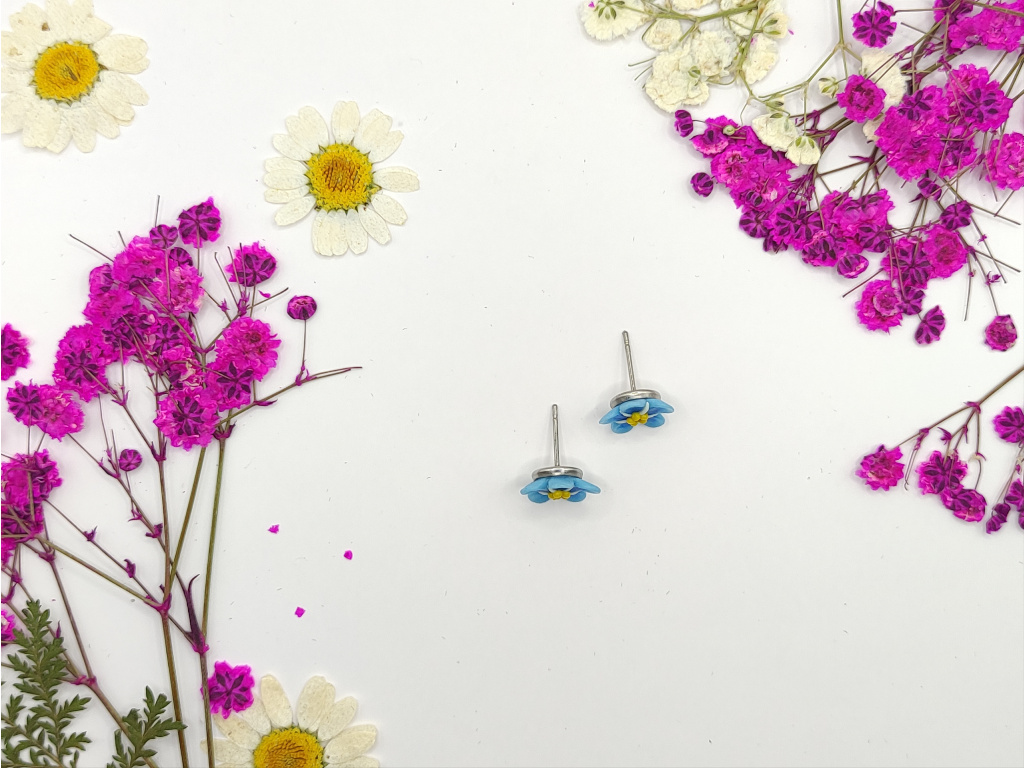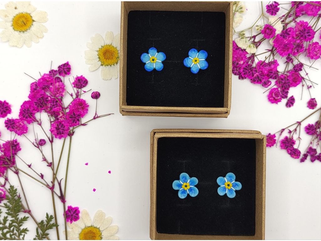 Ručně modelované květy Pomněnek z polymerové hmoty Fimo. Puzetky NEJSOU lepené. Pomněnky jsou na plošce. Komponenty z chirurgické oceli.