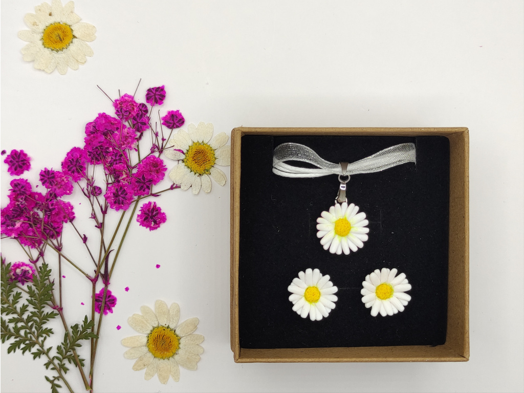 Ručně modelované květy Sedmikrásek z polymerové hmoty Fimo. Komponenty z chirurgické oceli.